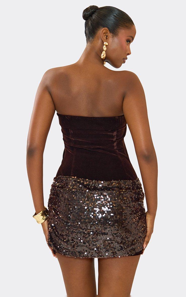 Bandeau Sequin Contrast Detail Mini Dress In Brown Velvet