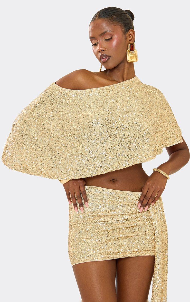 off the shoulder cape top in gold sequin