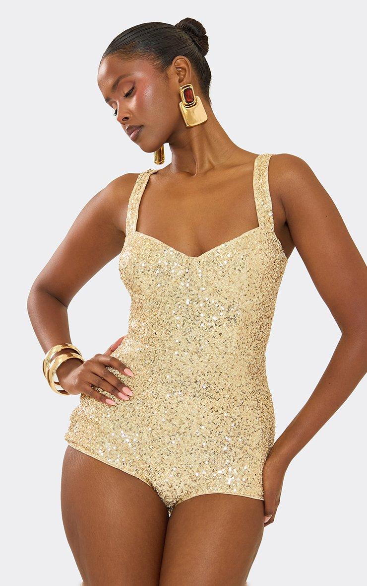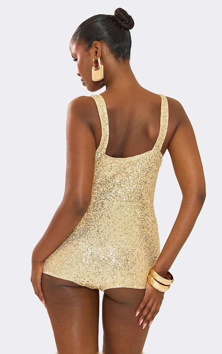 Cupped Detail Strappy Micro Playsuit In Gold Sequin