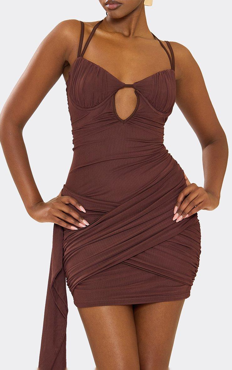 Cut Out Strappy Underwired Detail Drape Front Mini Dress In Brown