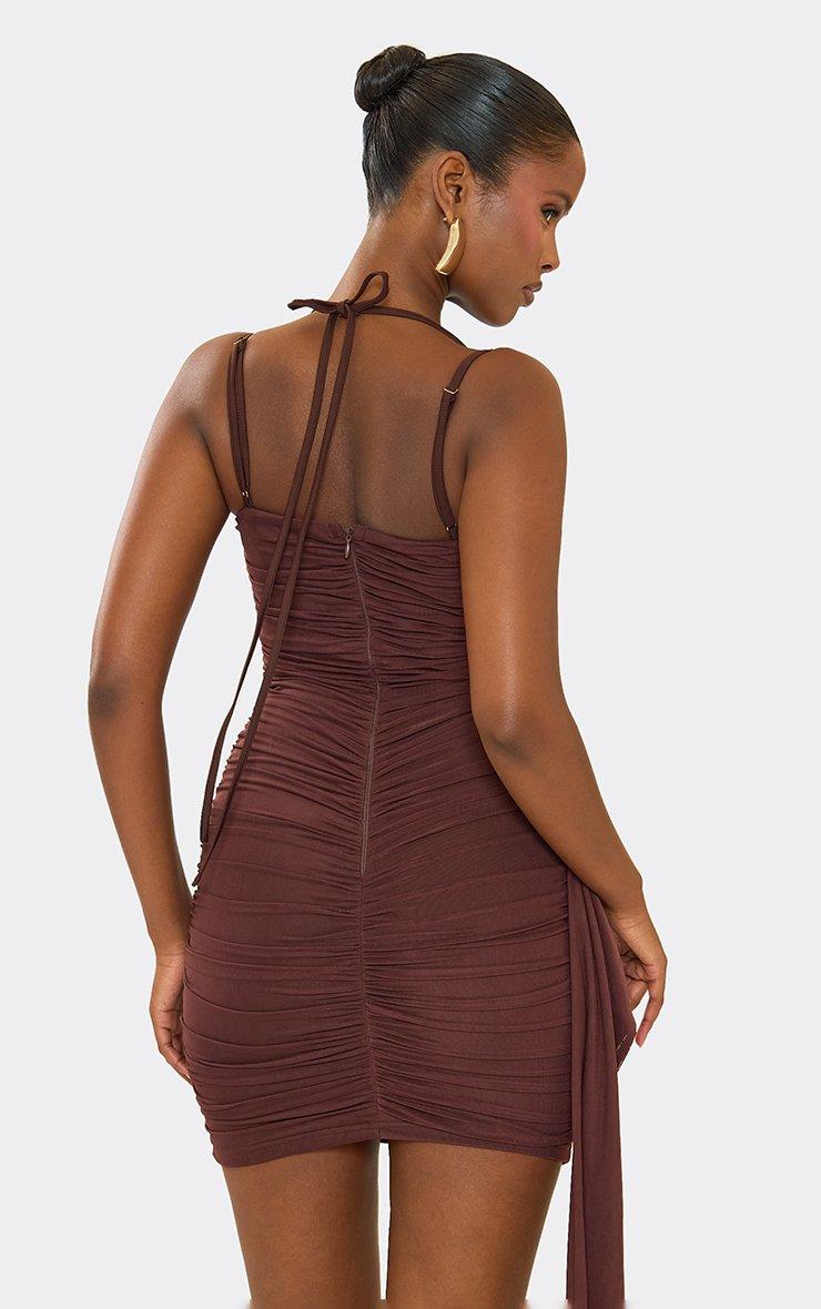 V Neck Plunge Ruched Detail Mini Dress In Chocolate Brown