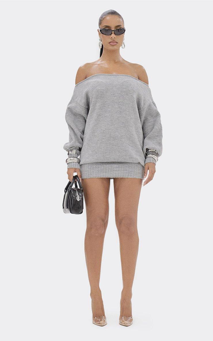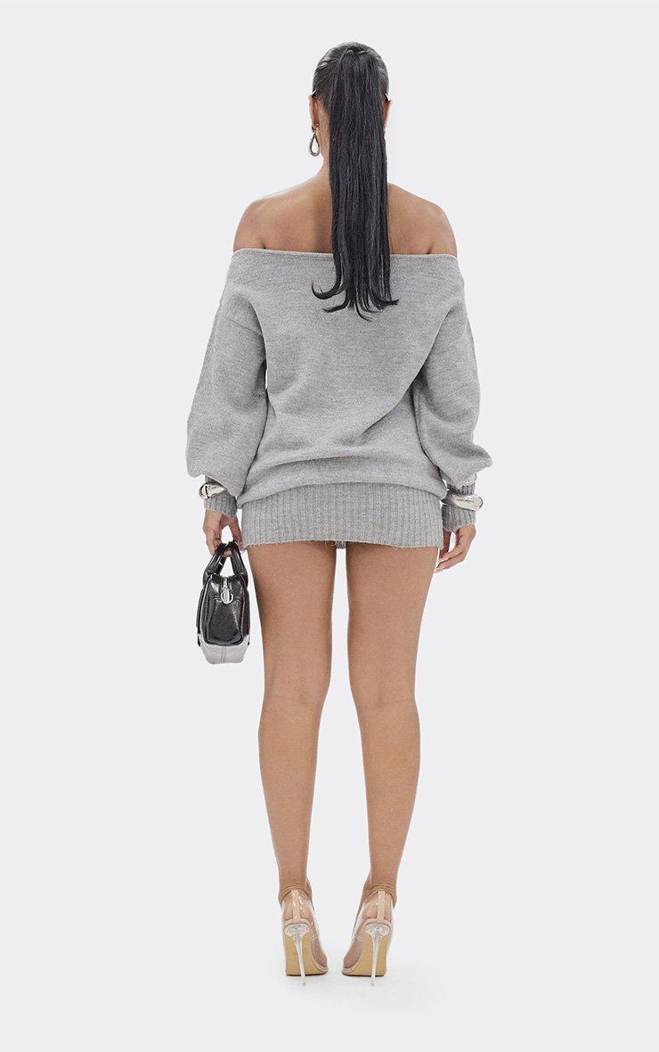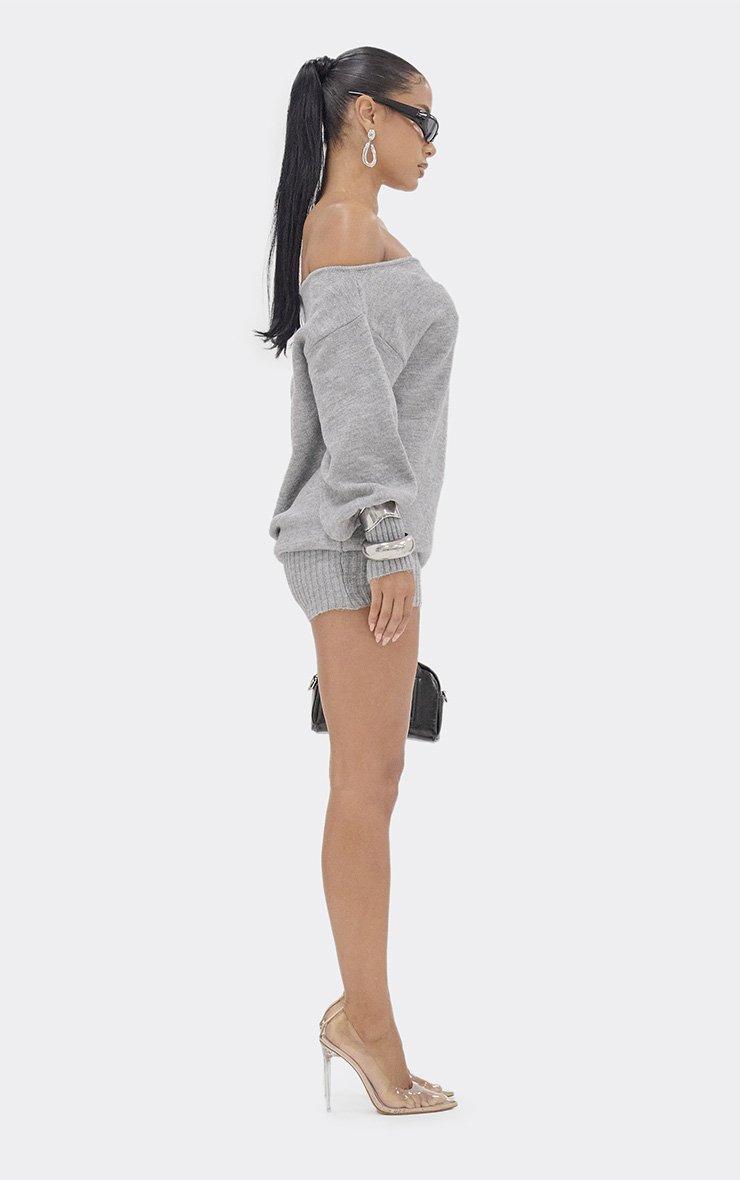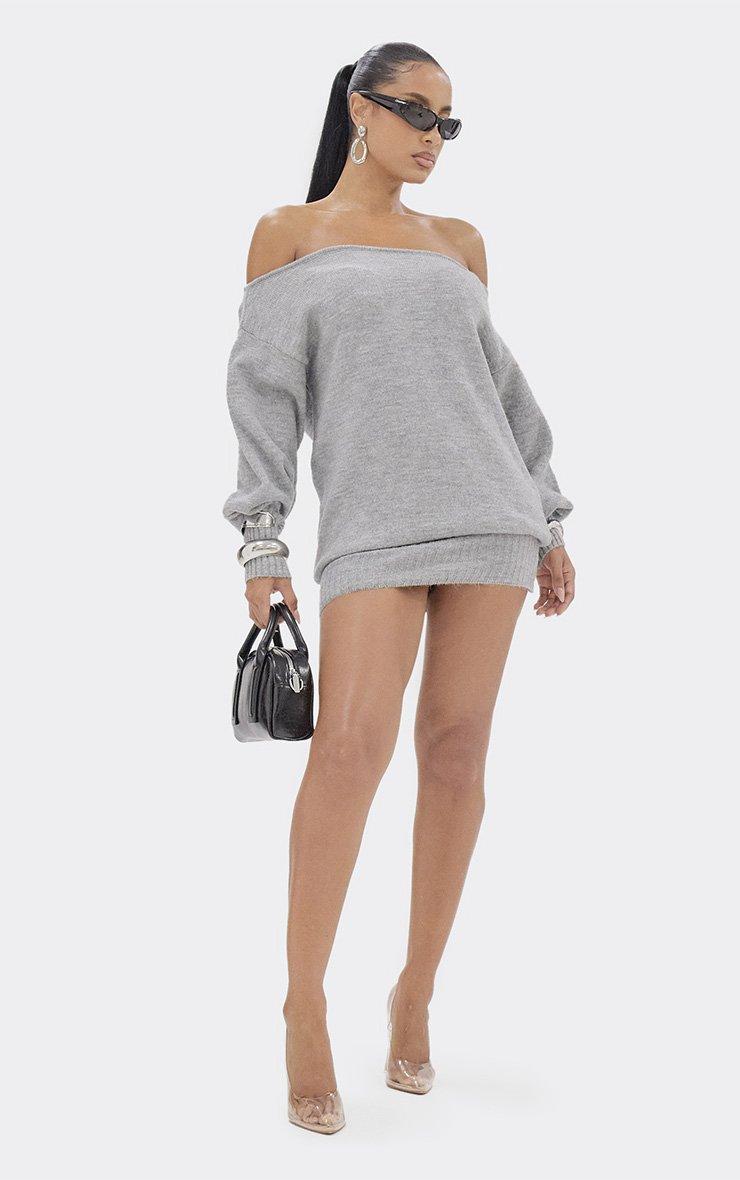 Long Flared Sleeve Drape Detail Mini Bodycon Dress In Grey Knit