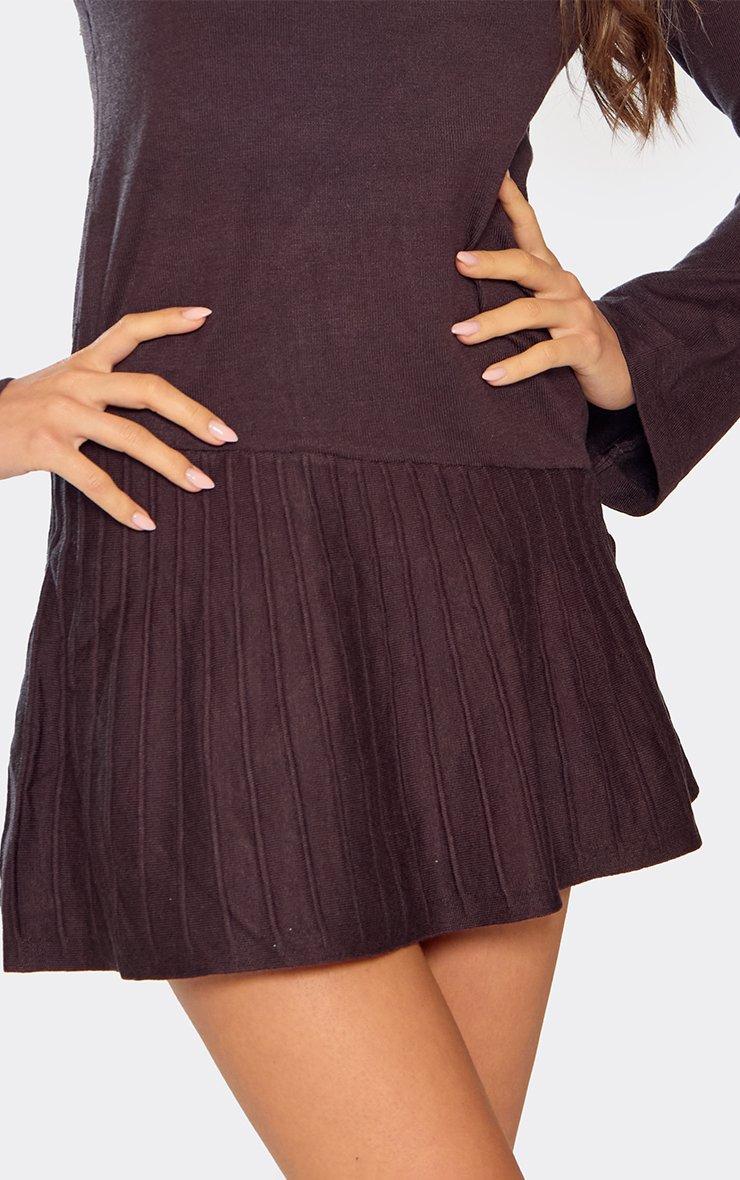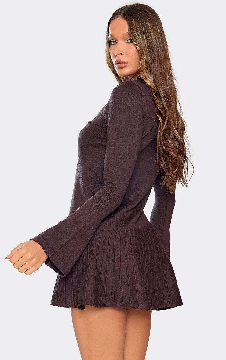 long sleeve skater mini dress in chocolate brown ribbed knit