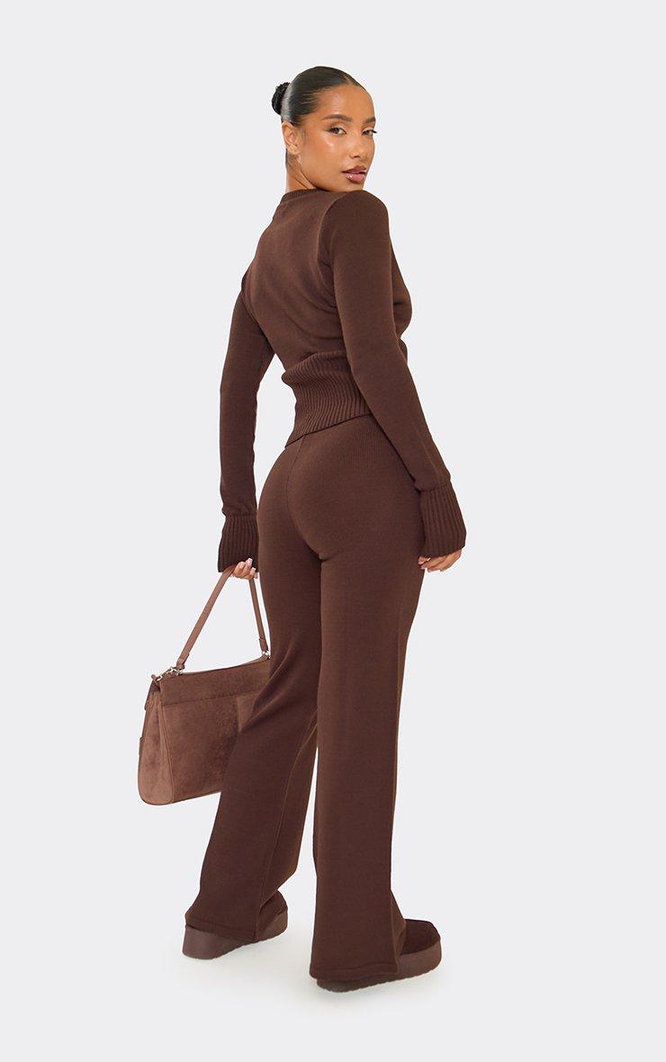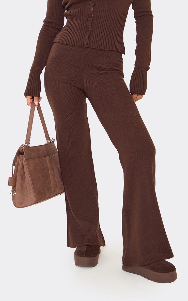 High Waist Wide Leg Trousers In Chocolate Brown Knit