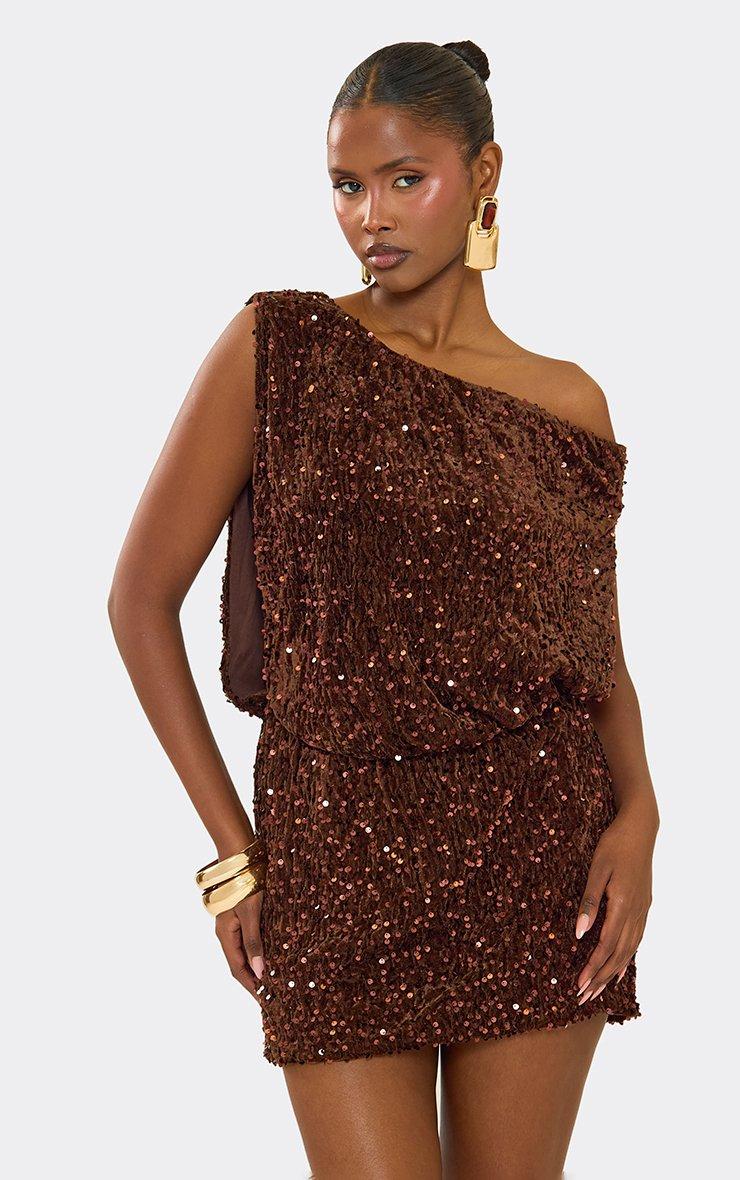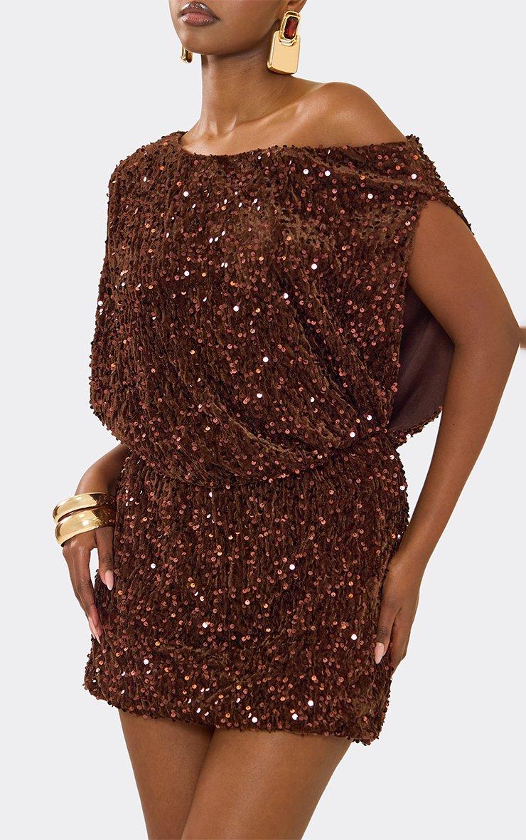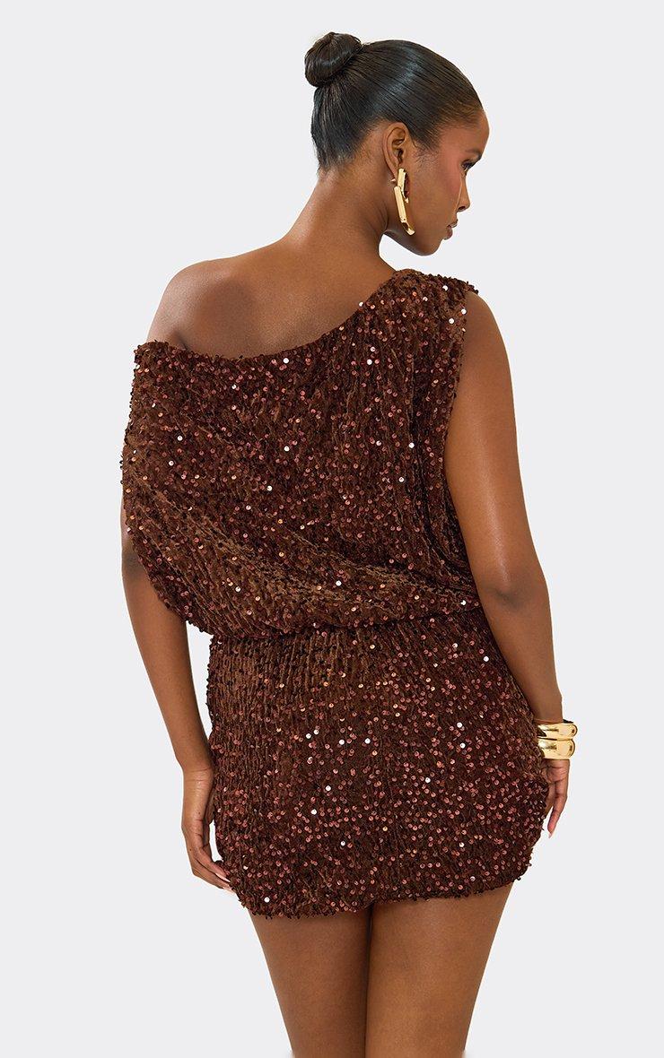 Off The Shoulder Blouson Mini Dress In Brown Velvet Sequin
