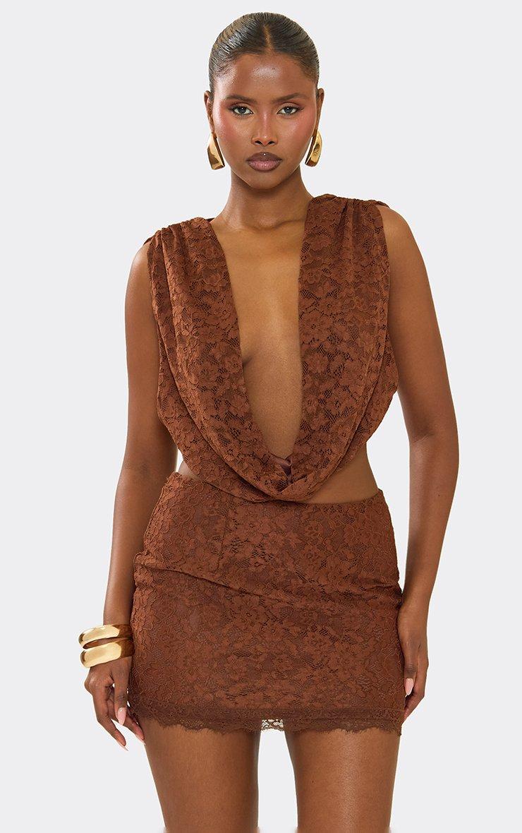 Ruched Cowl Front Tie Back Top In Brown Lace