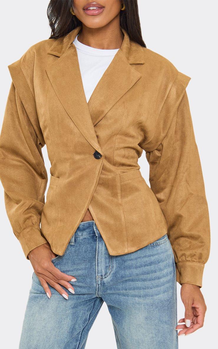 long sleeve cinched waist detail tie back blazer in stone faux suede