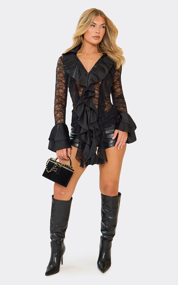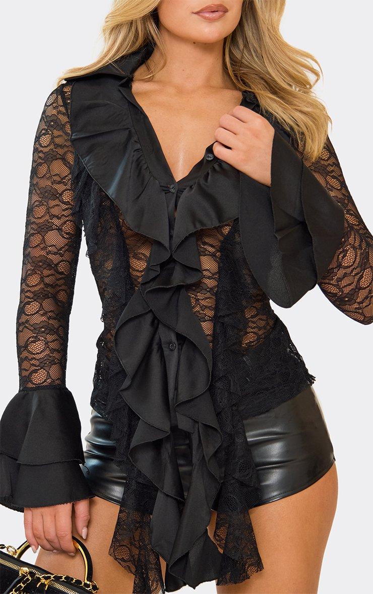 Long Sleeve Ruffle Detail Button Front Shirt In Black Lace