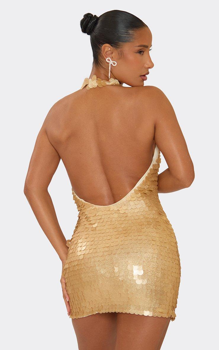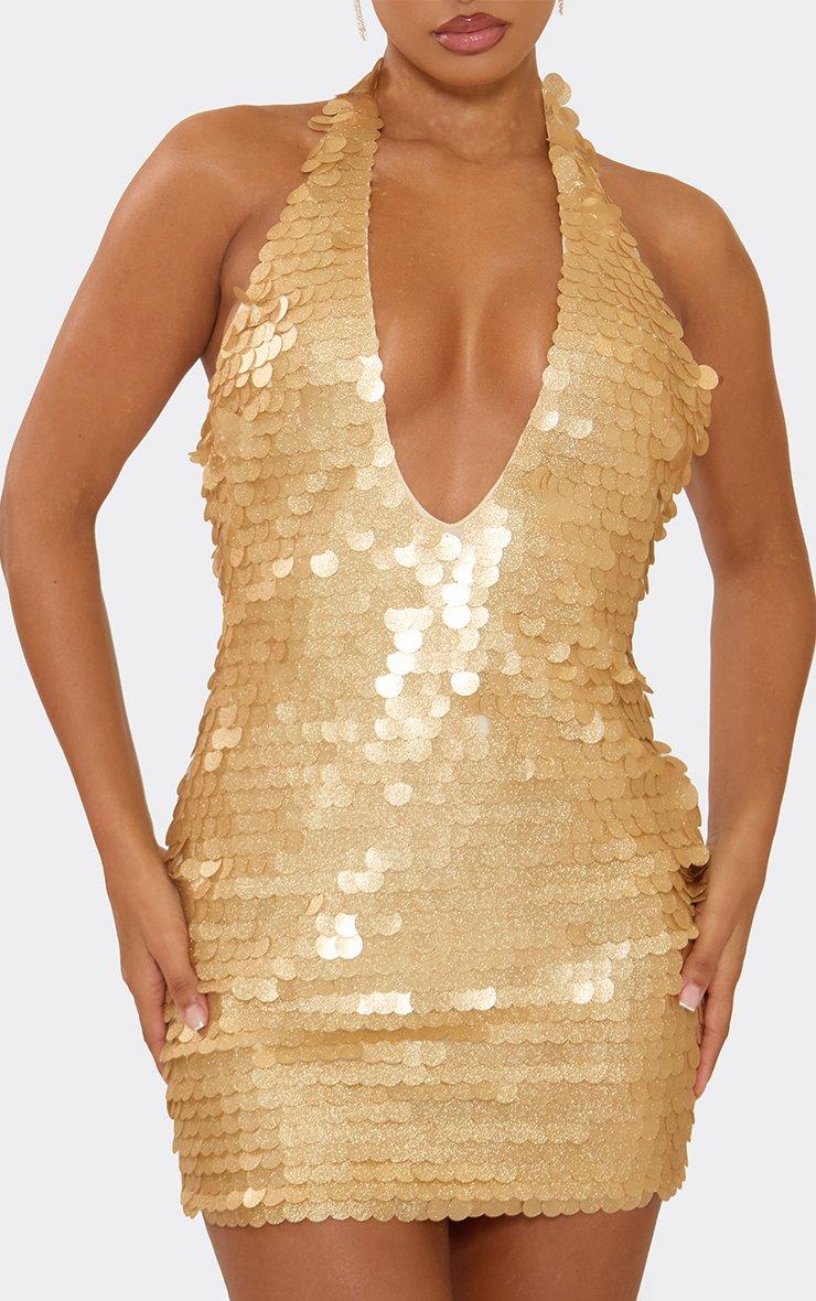 Extreme Plunge Halterneck Bodycon Mini Dress In Gold Disc Sequin