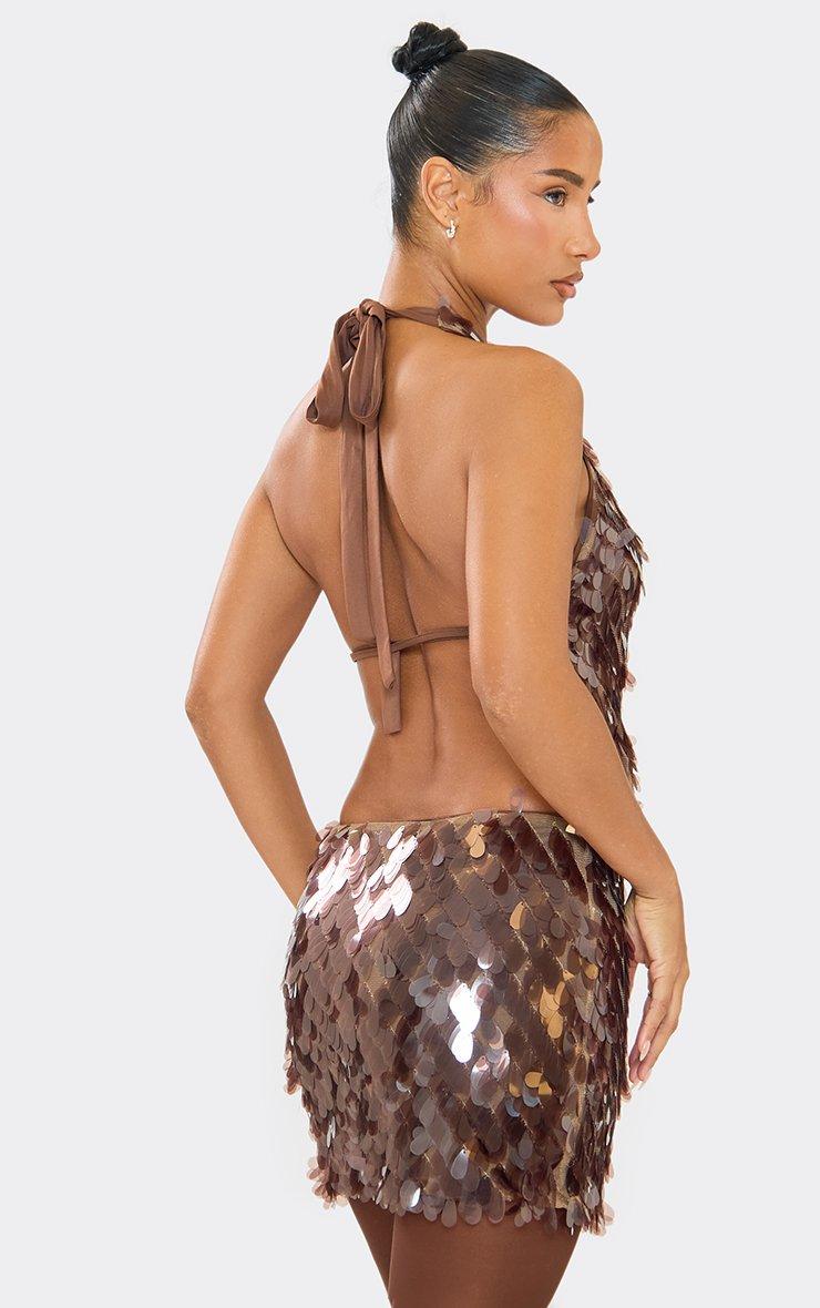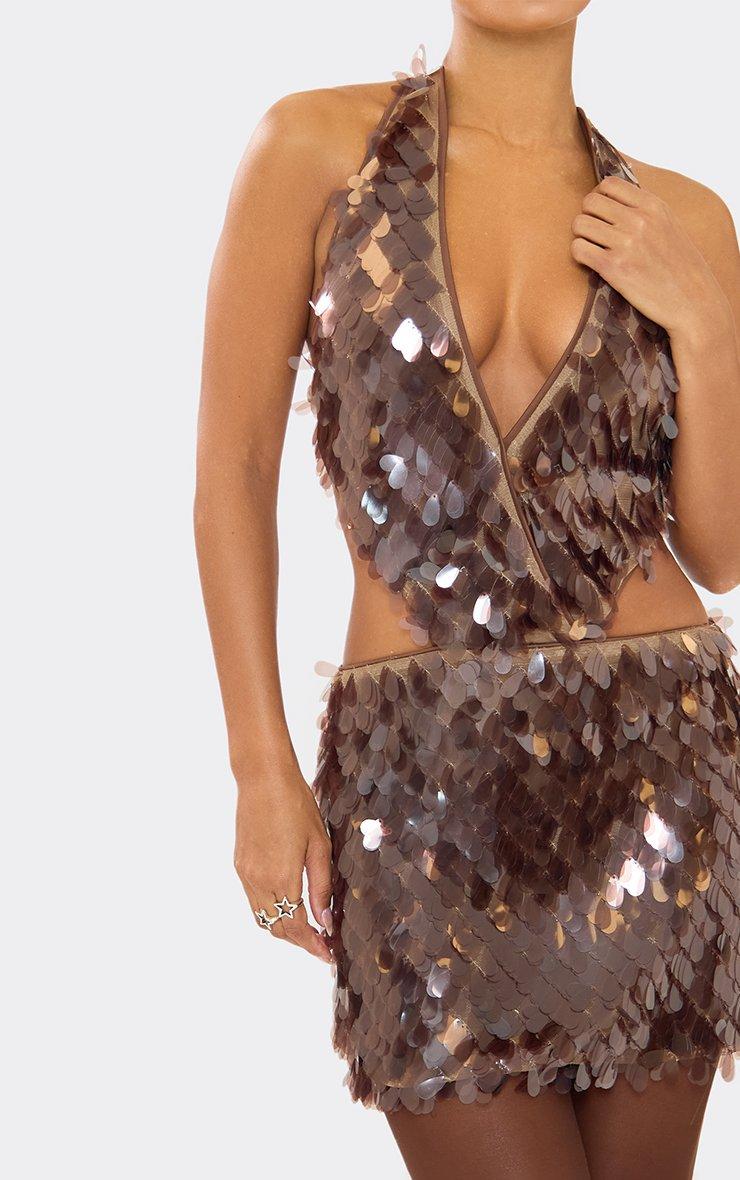 Extreme Plunge Cut Out Detail Mini Dress In Chocolate Brown Sequin