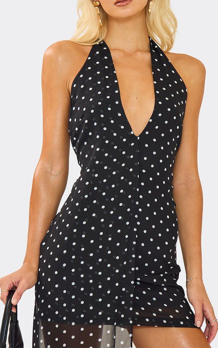Plunge Halterneck Front Drape Detail Mini Dress In Black Polka Dot