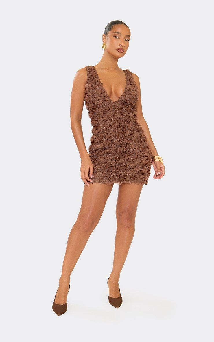 plunge front floral applique mini dress in chocolate brown