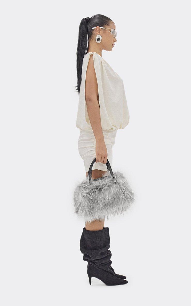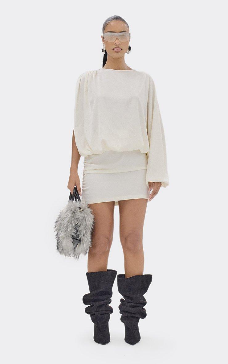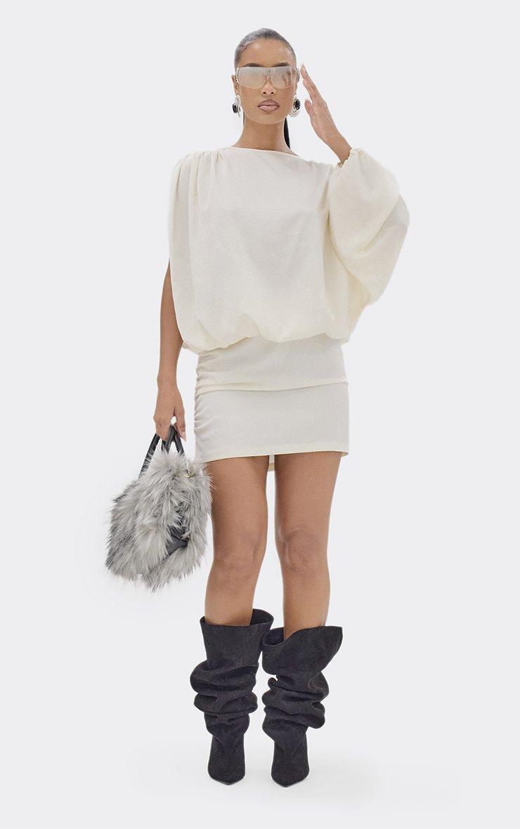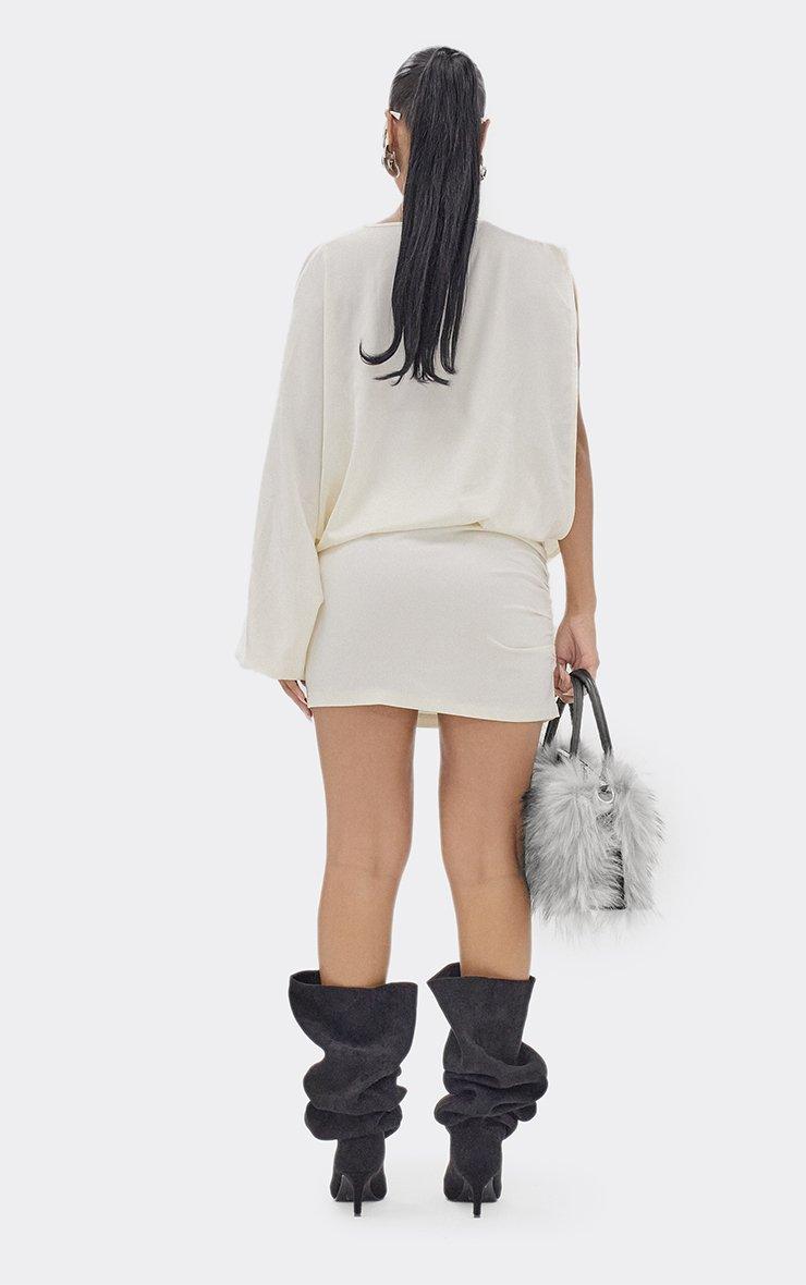 One Sleeve Blouson Drape Detail Mini Dress In Cream