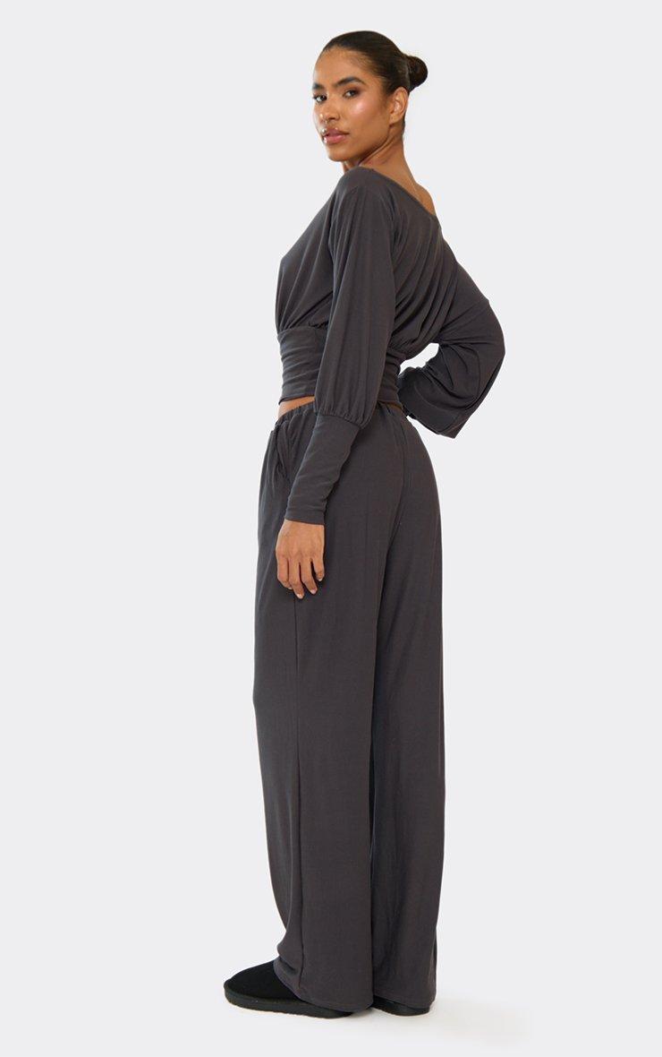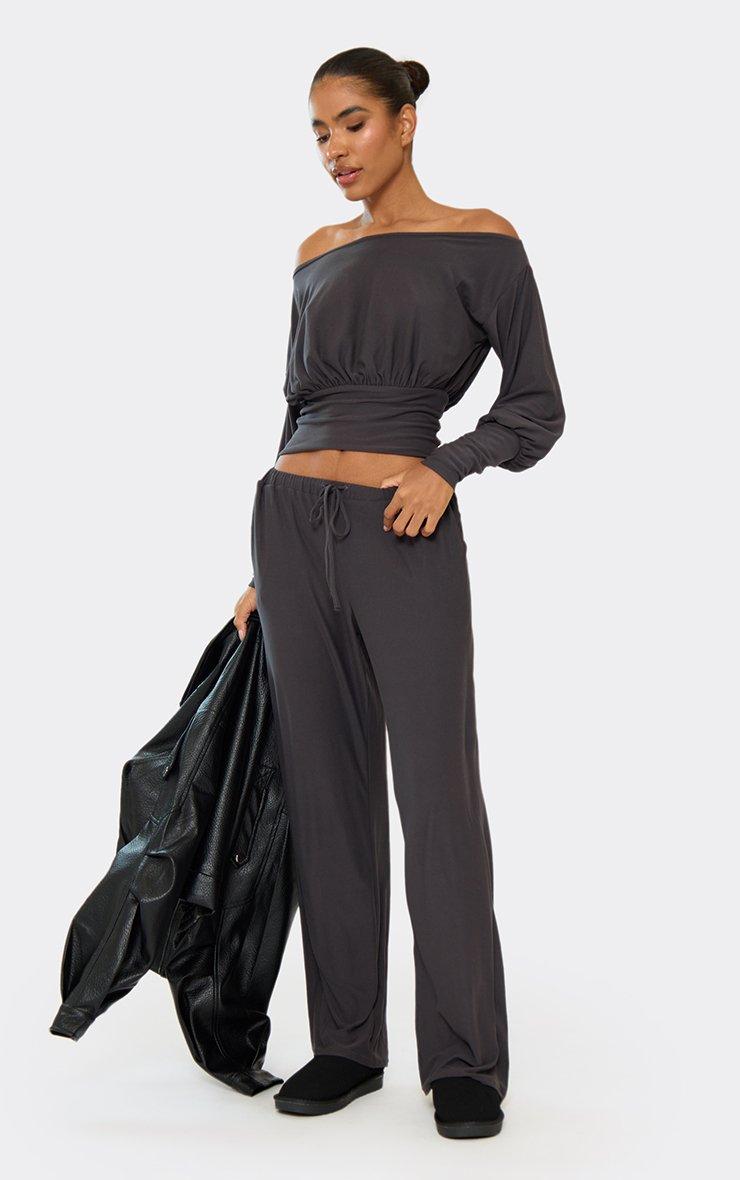 Drawstring Waist Straight Leg Trousers In Grey Ribbed