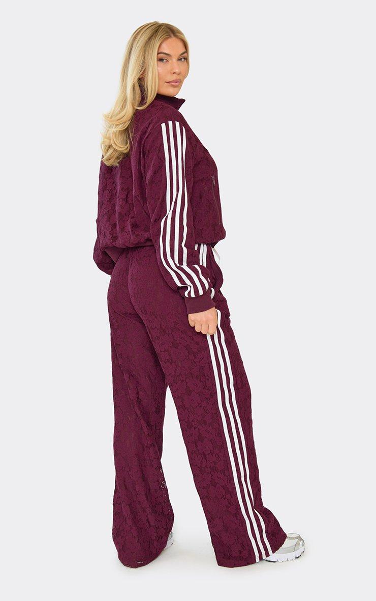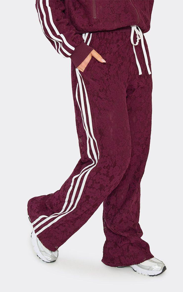 mid rise contrast stripe straight leg joggers in plum floral crochet