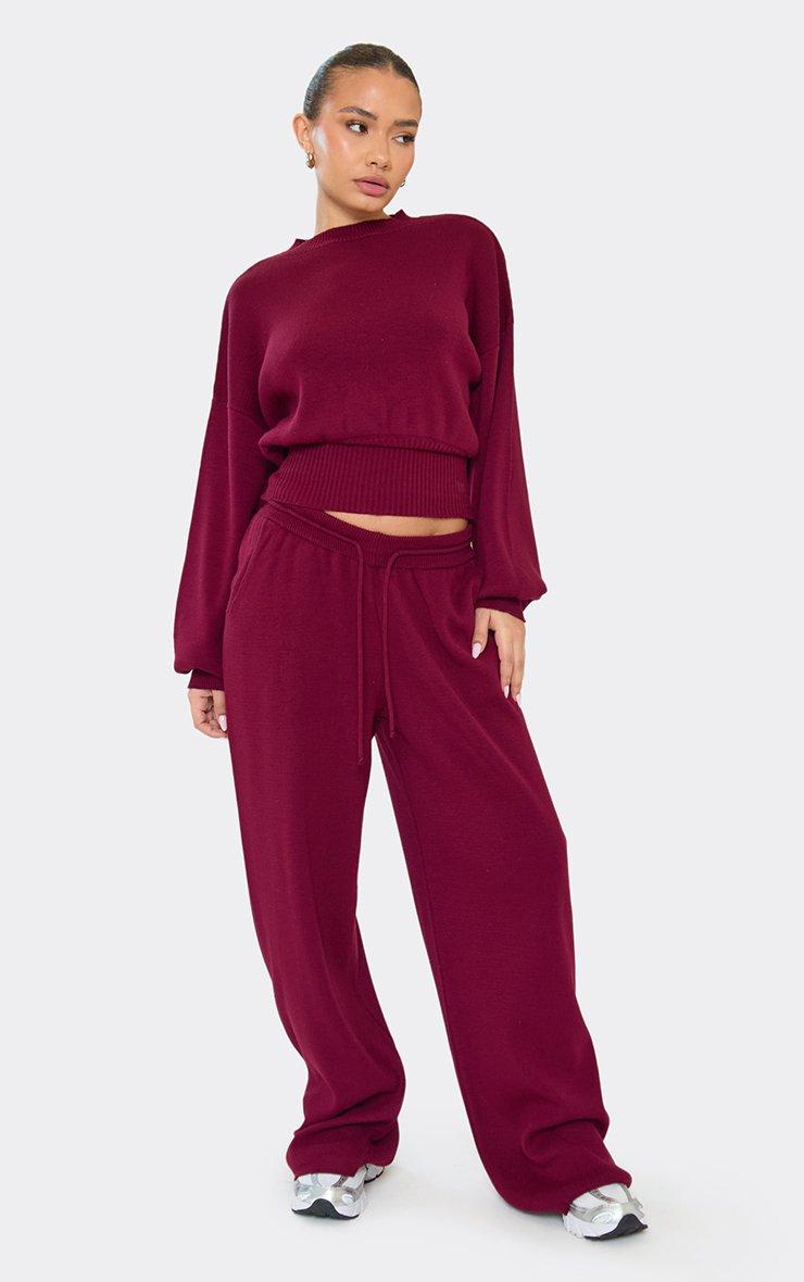 Mid Rise Fluffy Essential Logo Detail Wide Leg Trousers In Burgundy Knit