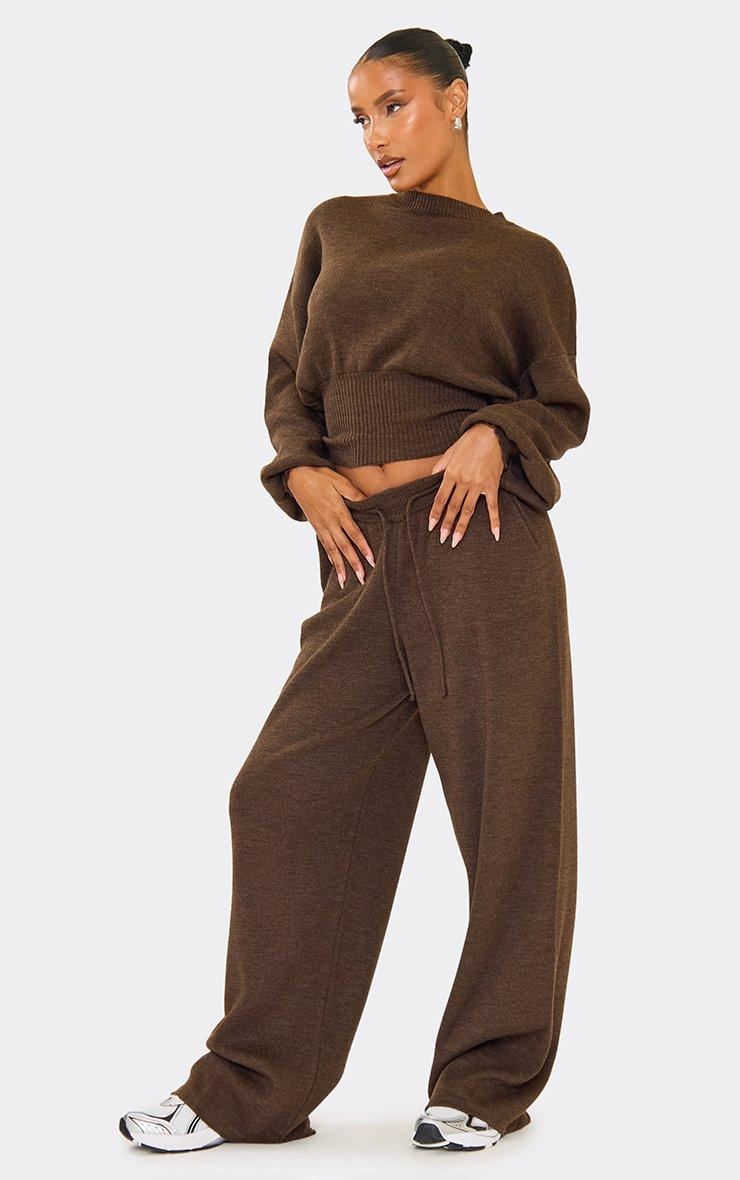 Mid Rise Ego Logo Wide Leg Trousers In Chocolate Brown Knit