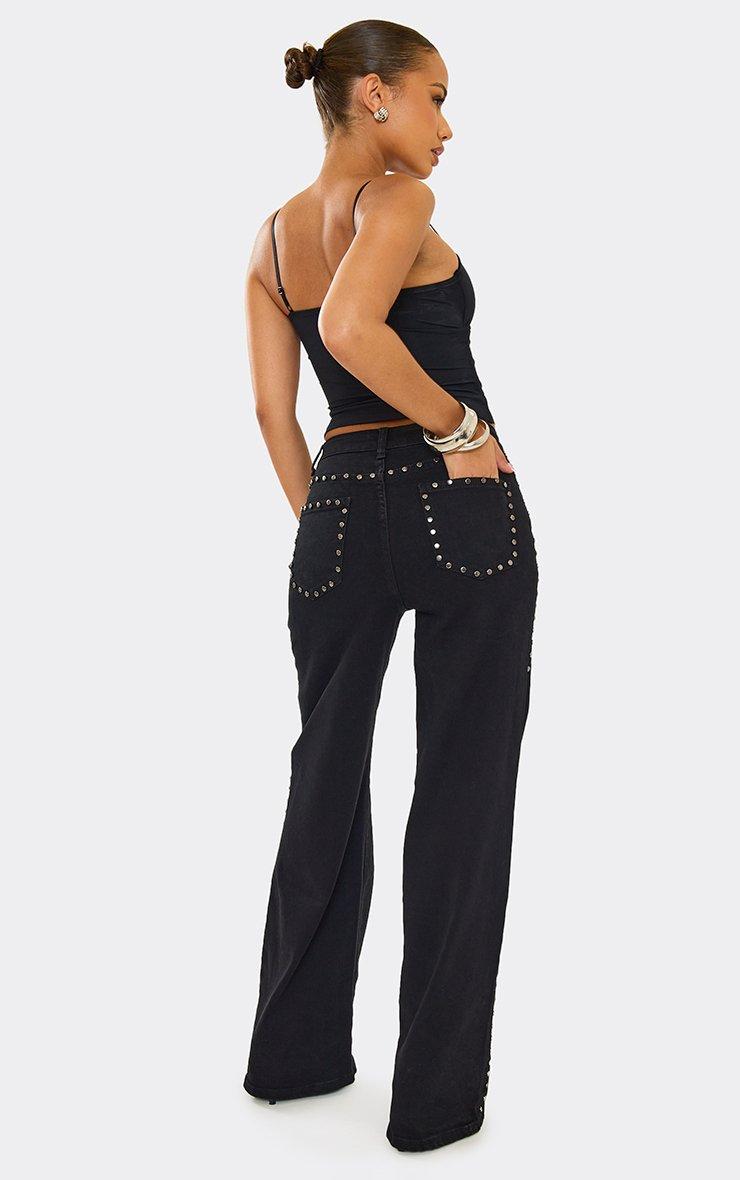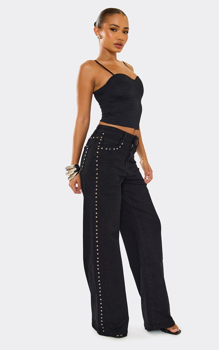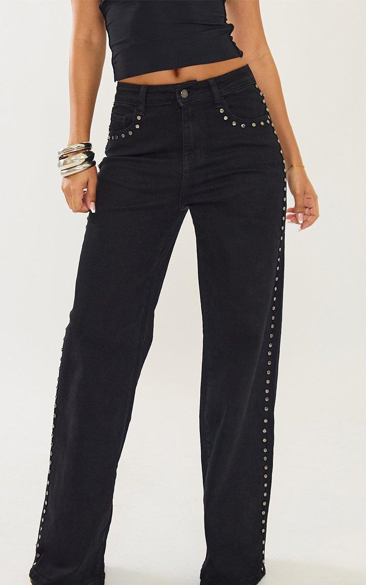 Mid Rise Studded Detail Wide Leg Jeans In Black Denim