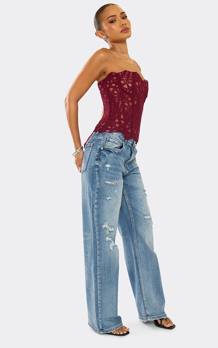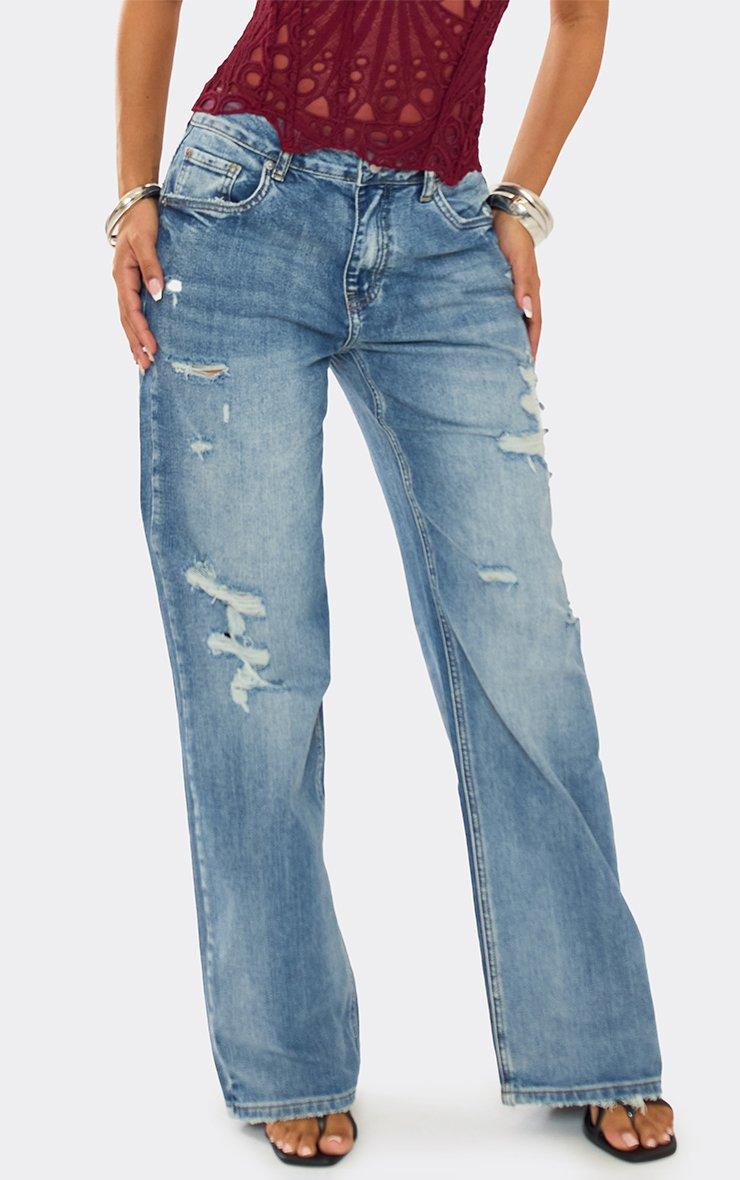 Mid Rise Distressed Detail Wide Leg Jeans In Washed Mid Blue Denim