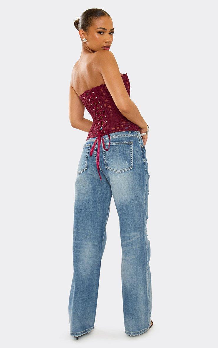 Low Rise Eyelet Detail Straight Leg Jeans In Vintage Wash Denim