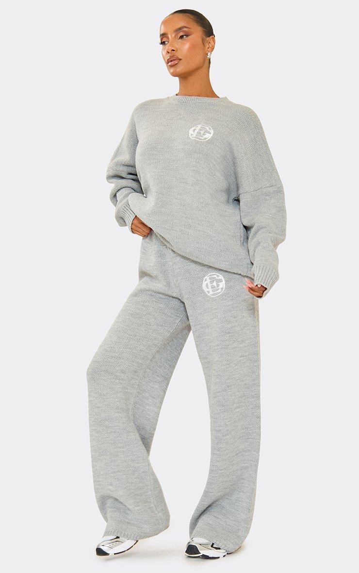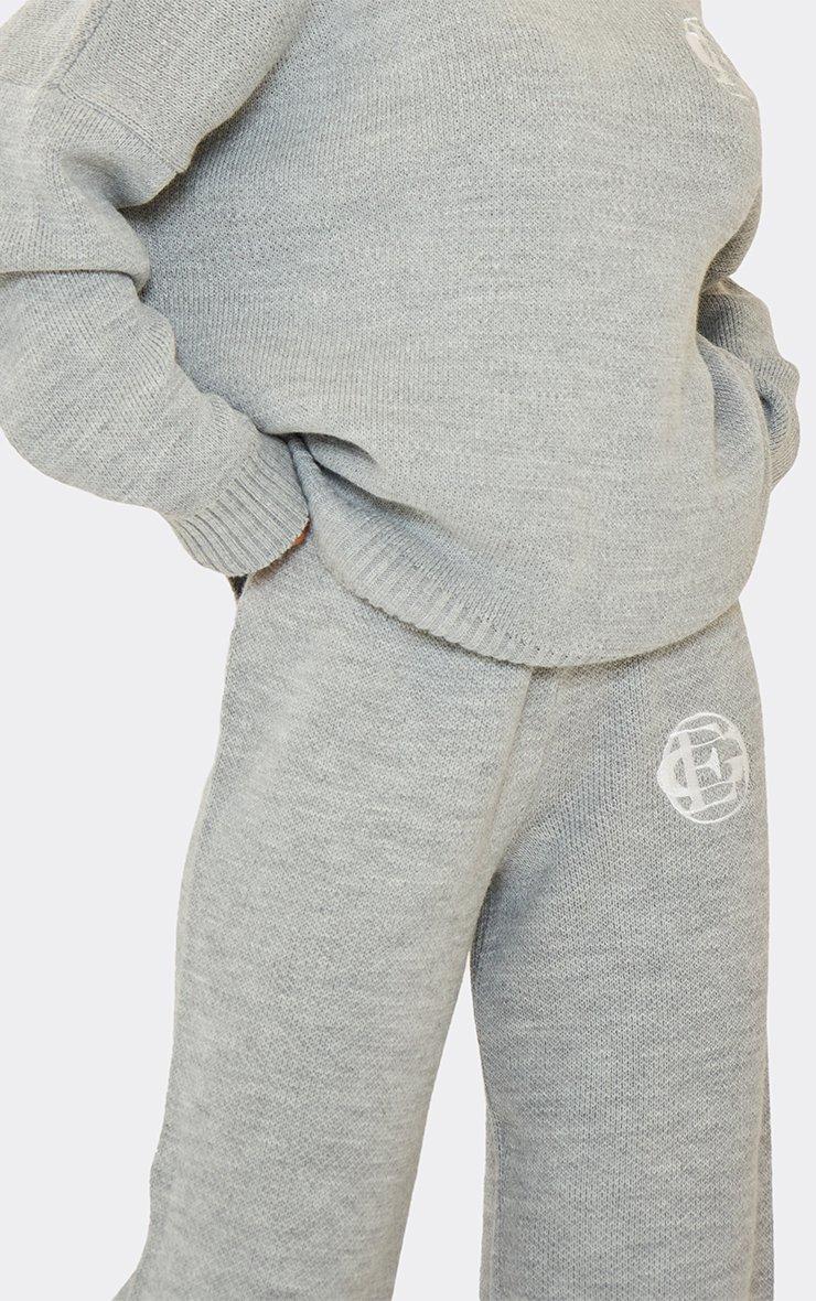 High Waist Embroidered Ego Logo Wide Leg Trousers In Grey Knit