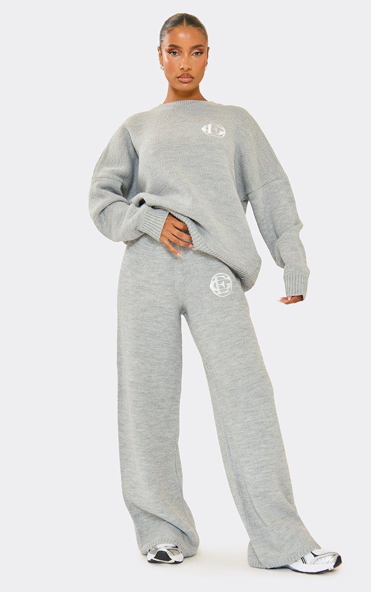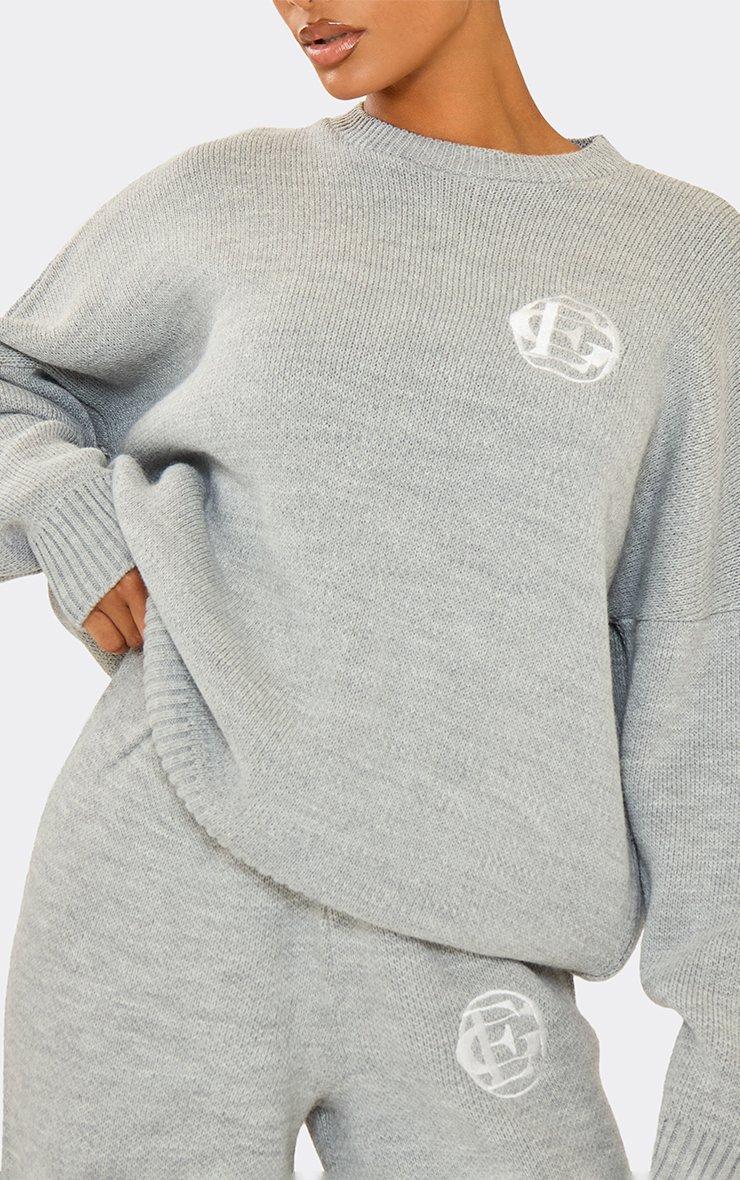 Long Sleeve Crew Neck Ego Graphic Oversized Jumper In Grey Knit