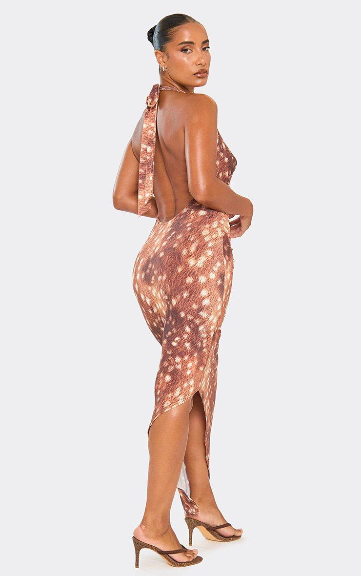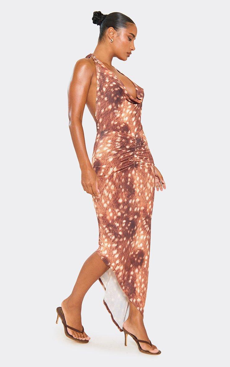 Cowl Neck Asymmetric Hem Maxi Dress In Brown Deer Print