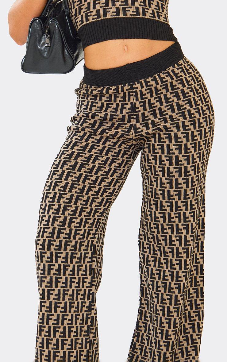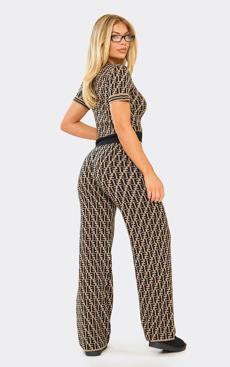 Mid Waist Ego Graphic Straight Leg Trousers In Brown Knit