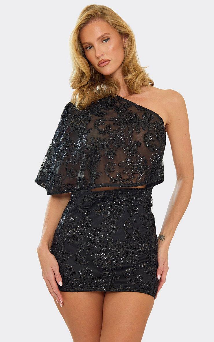 Cape One Shoulder Cut Out Mini Dress In Black Sequin