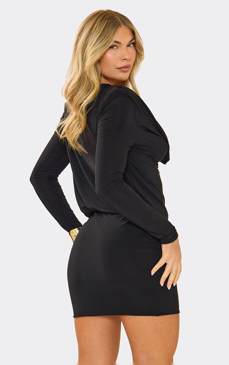 Shoulder Pad Drape Cowl Neck Mini Dress In Black Slinky
