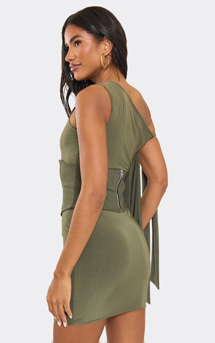 One Shoulder Choker Drape Detail Mini Dress In Khaki Slinky