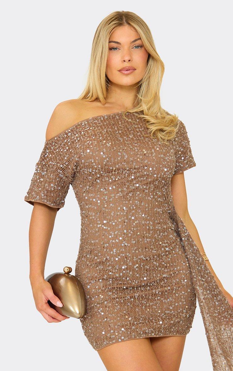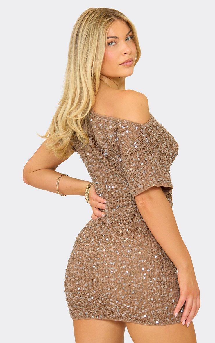Short Sleeve Drape Detail Mini Dress In Brown Textured Sequin
