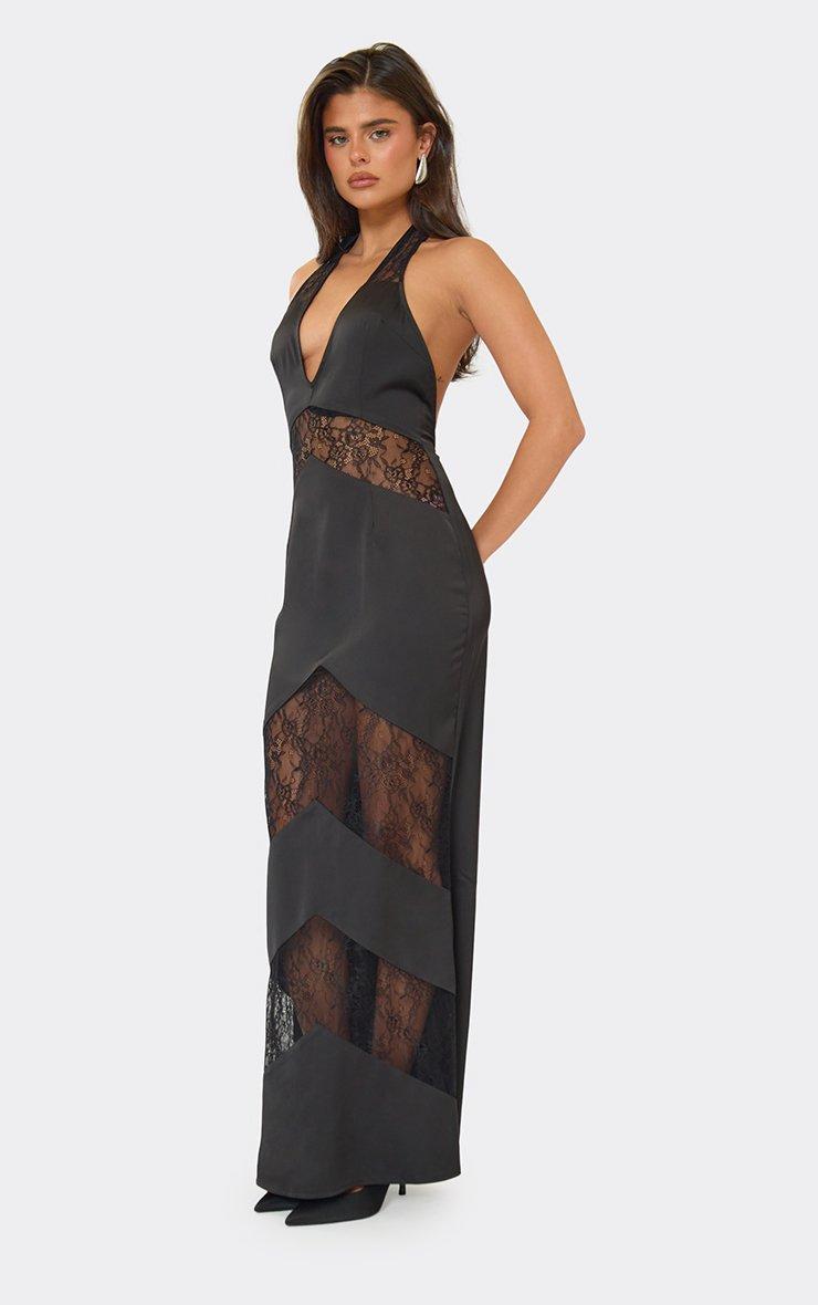 plunge halterneck contrast lace panel detail maxi dress in black satin