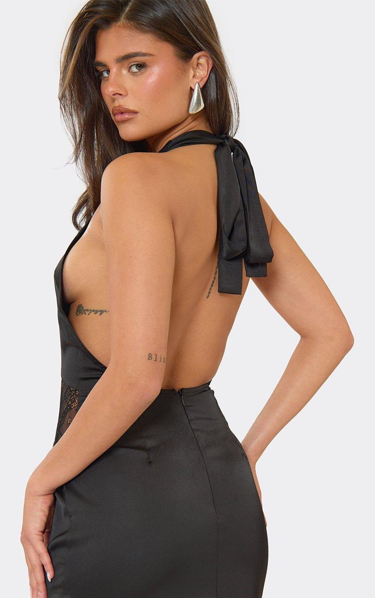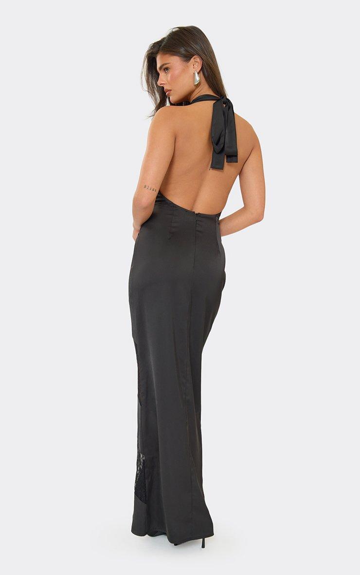 Plunge Halterneck Contrast Lace Panel Detail Maxi Dress In Black Satin