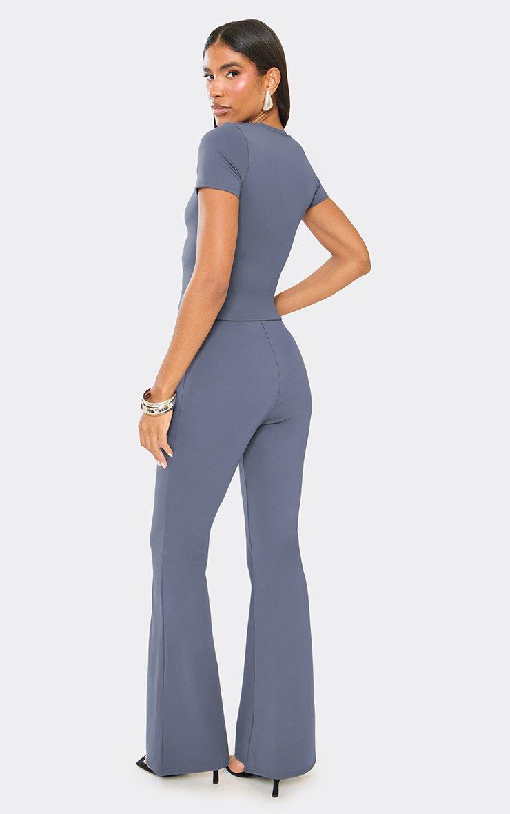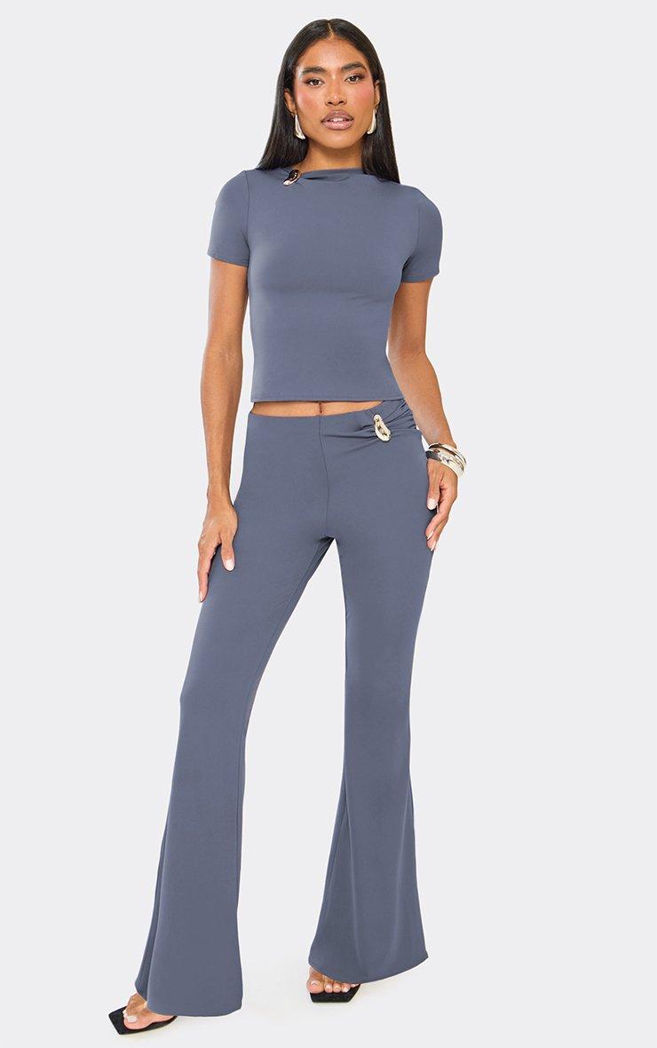 Low Rise Ruched Trim Detail Flared Leg Trousers In Steel Blue