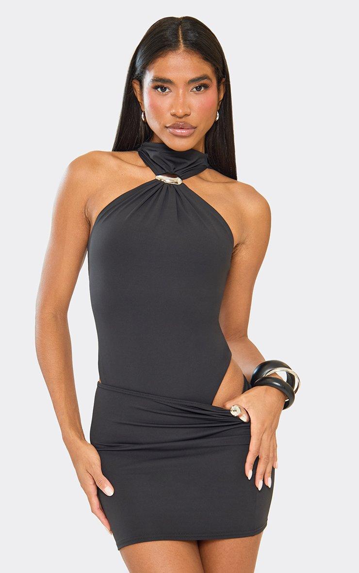 Long Sleeve Cowl Back Detail Top In Black Slinky