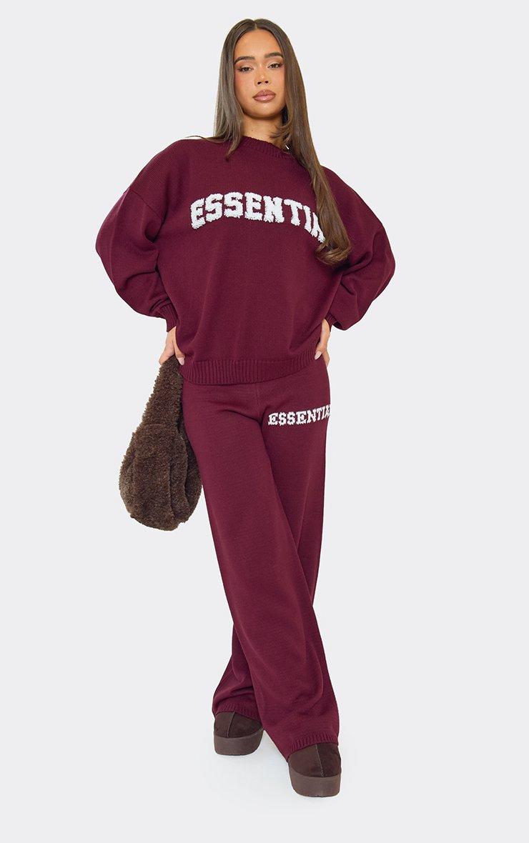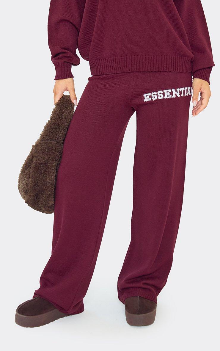 Mid Waist Ego Graphic Straight Leg Trousers In Burgundy Knit