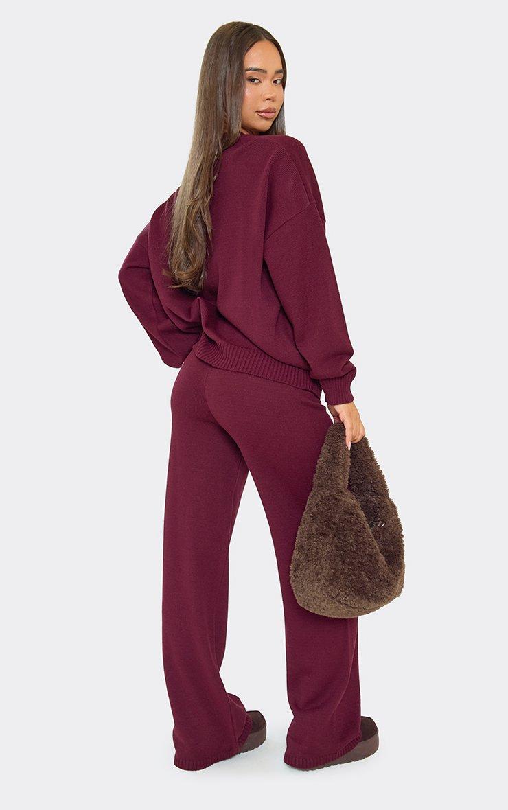 Mid Rise Fluffy Essential Logo Detail Wide Leg Trousers In Burgundy Knit