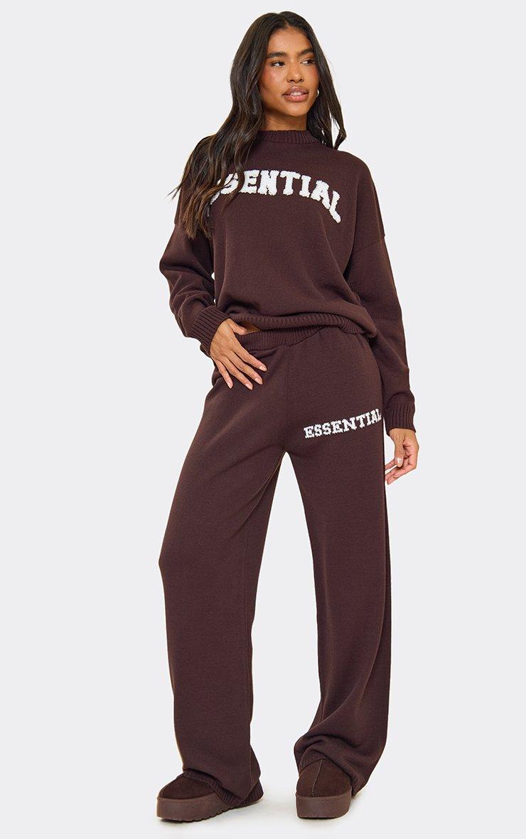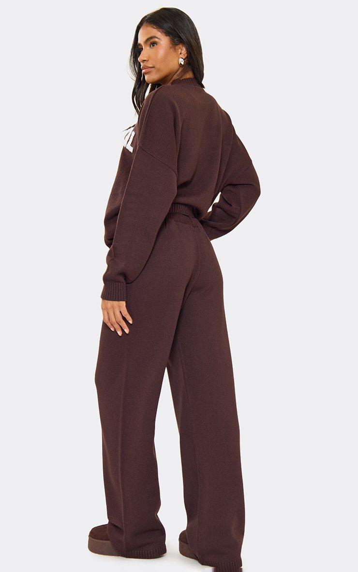 Mid Rise Ego Logo Wide Leg Trousers In Chocolate Brown Knit