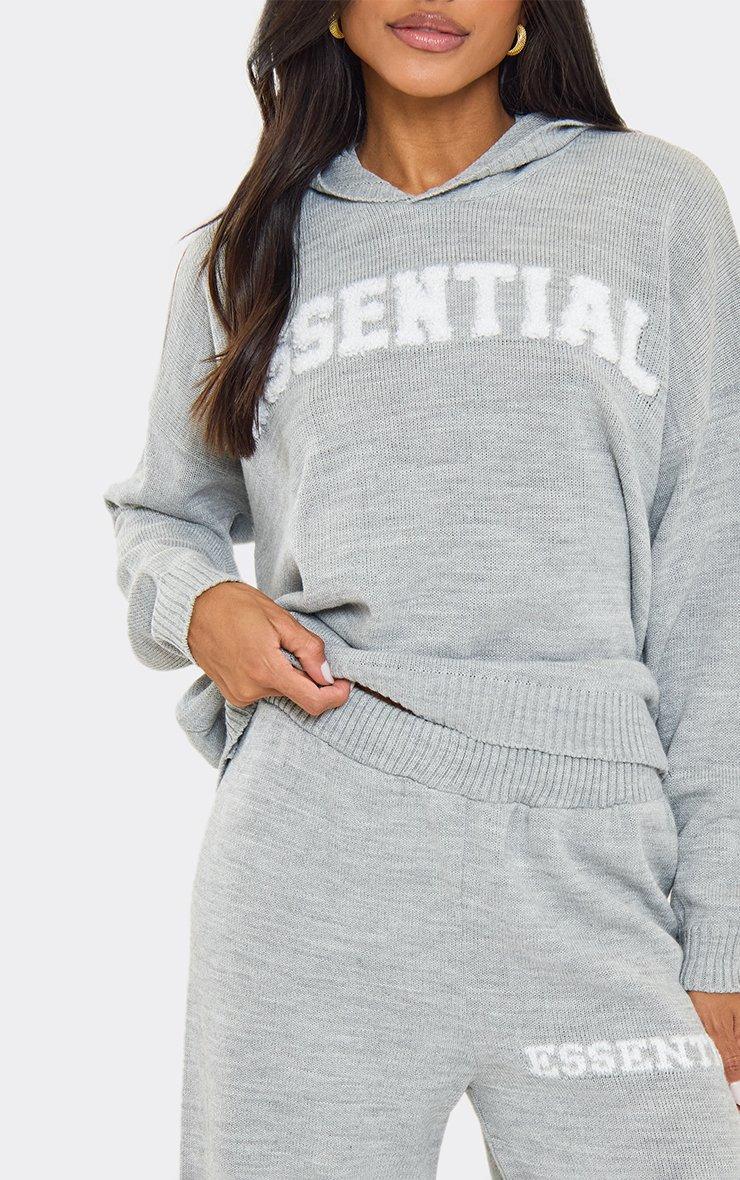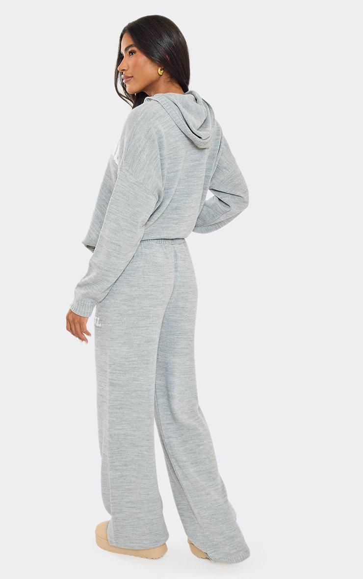 Mid Rise Fluffy Essential Logo Detail Wide Leg Trousers In Grey Knit