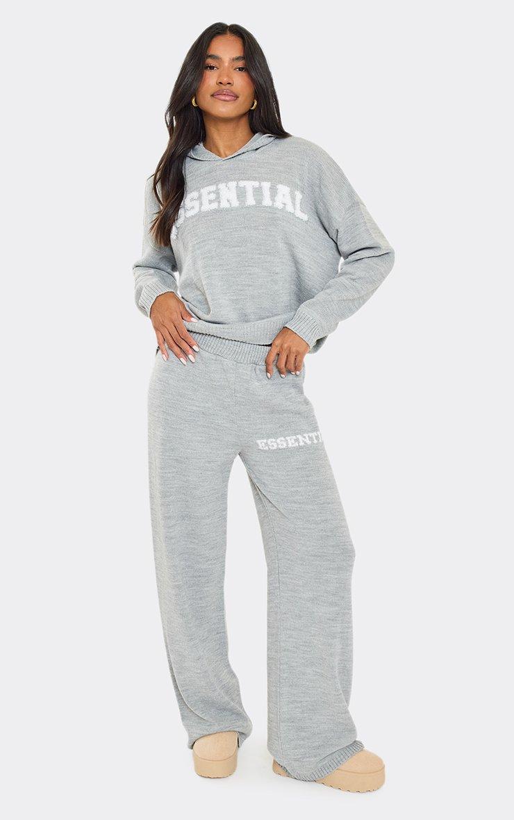 High Waist Embroidered Ego Logo Wide Leg Trousers In Grey Knit
