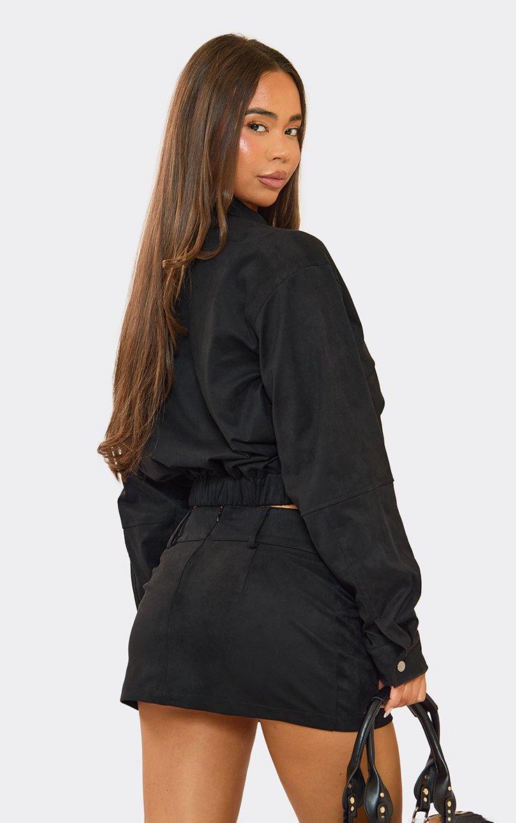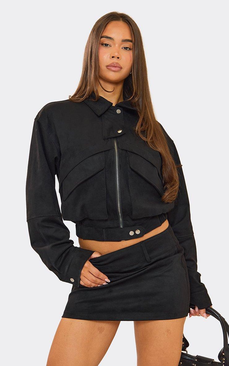 Oversized Pocket Front Zip Up Jacket In Black Faux Suede