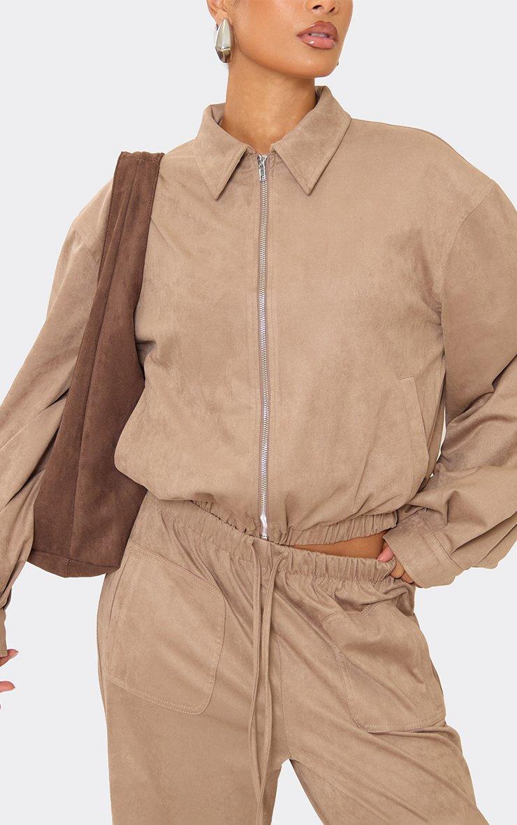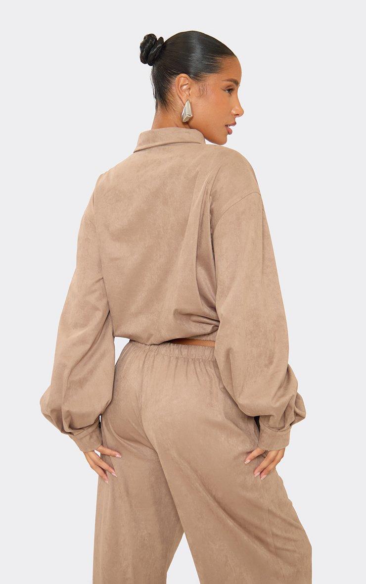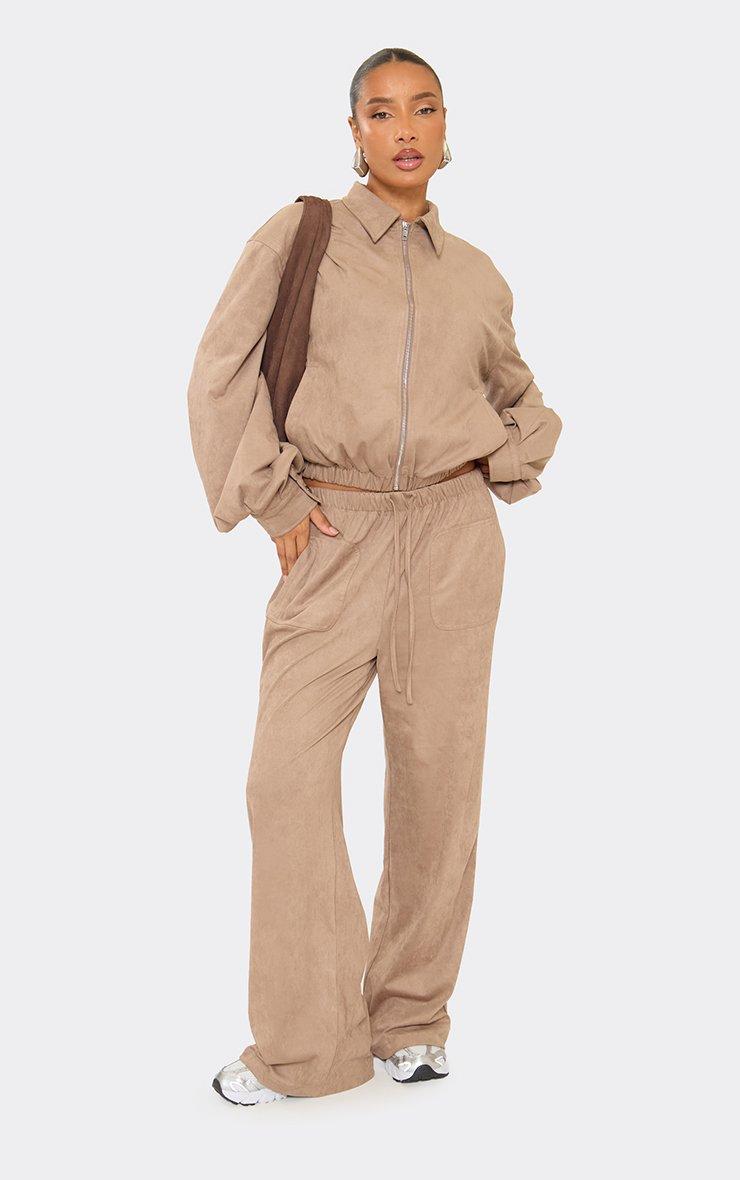 Drawstring Waist Straight Leg Trousers In Taupe Faux Suede