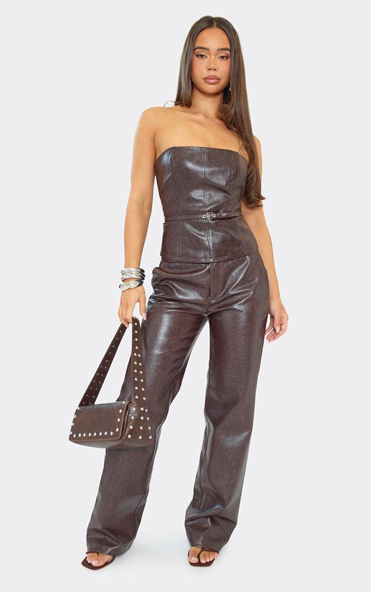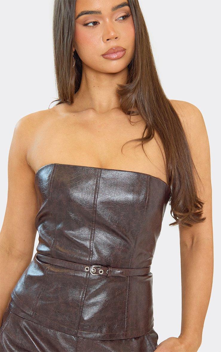 Bandeau Belt Detail Fitted Top In Chocolate Brown Faux Leather