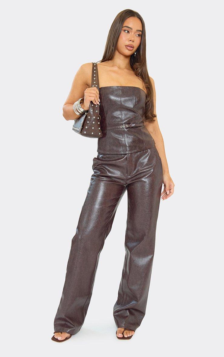 Mid Rise Straight Leg Trousers In Chocolate Brown Faux Leather
