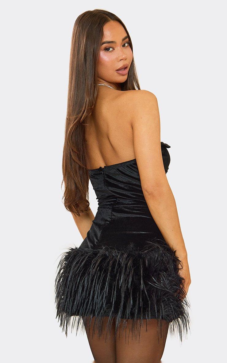 Bandeau Feather Hem Detail Mini Dress In Black Velvet