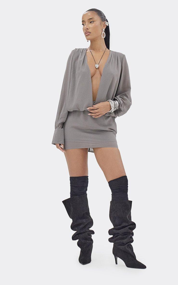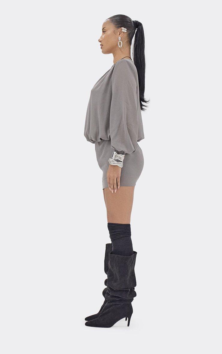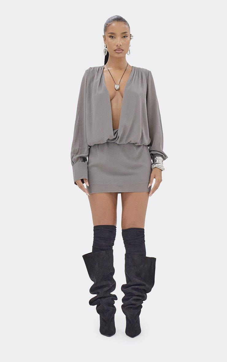 Long Sleeve Ruched Detail Mini Dress In Light Grey