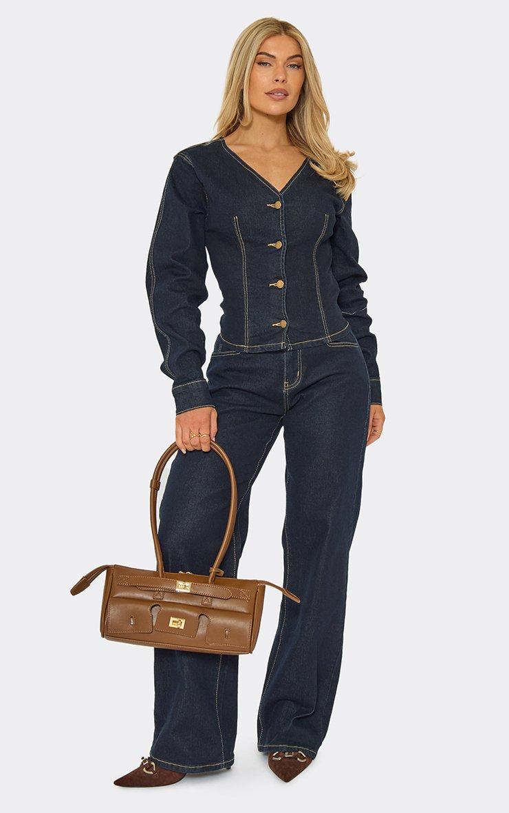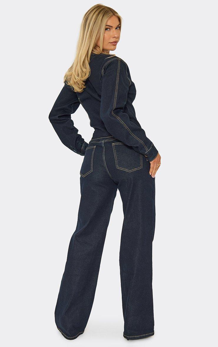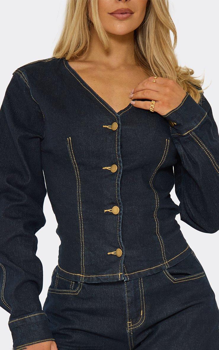 V Neck Button Down Seam Detail Fitted Jacket In Dark Indigo Denim