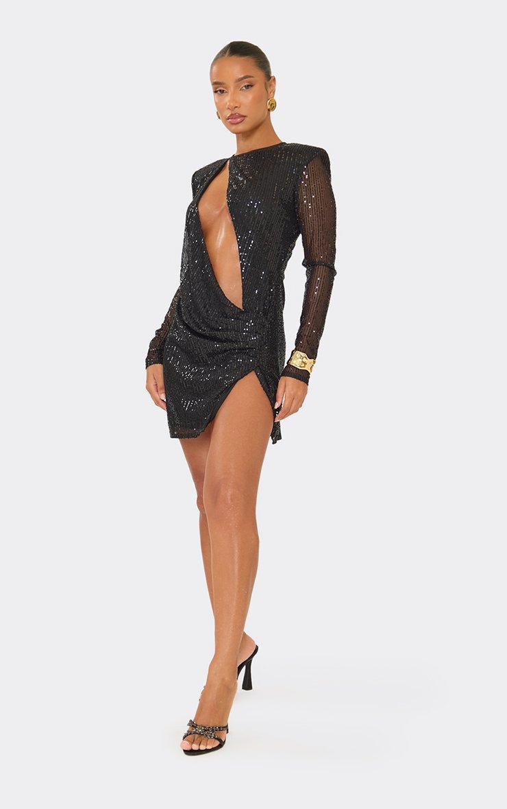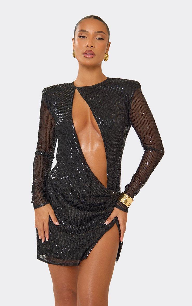 long sleeve cut out middle split leg detail mini dress in black sequin