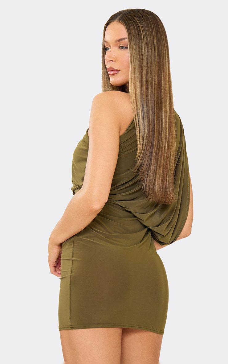 One Shoulder Choker Drape Detail Mini Dress In Khaki Slinky